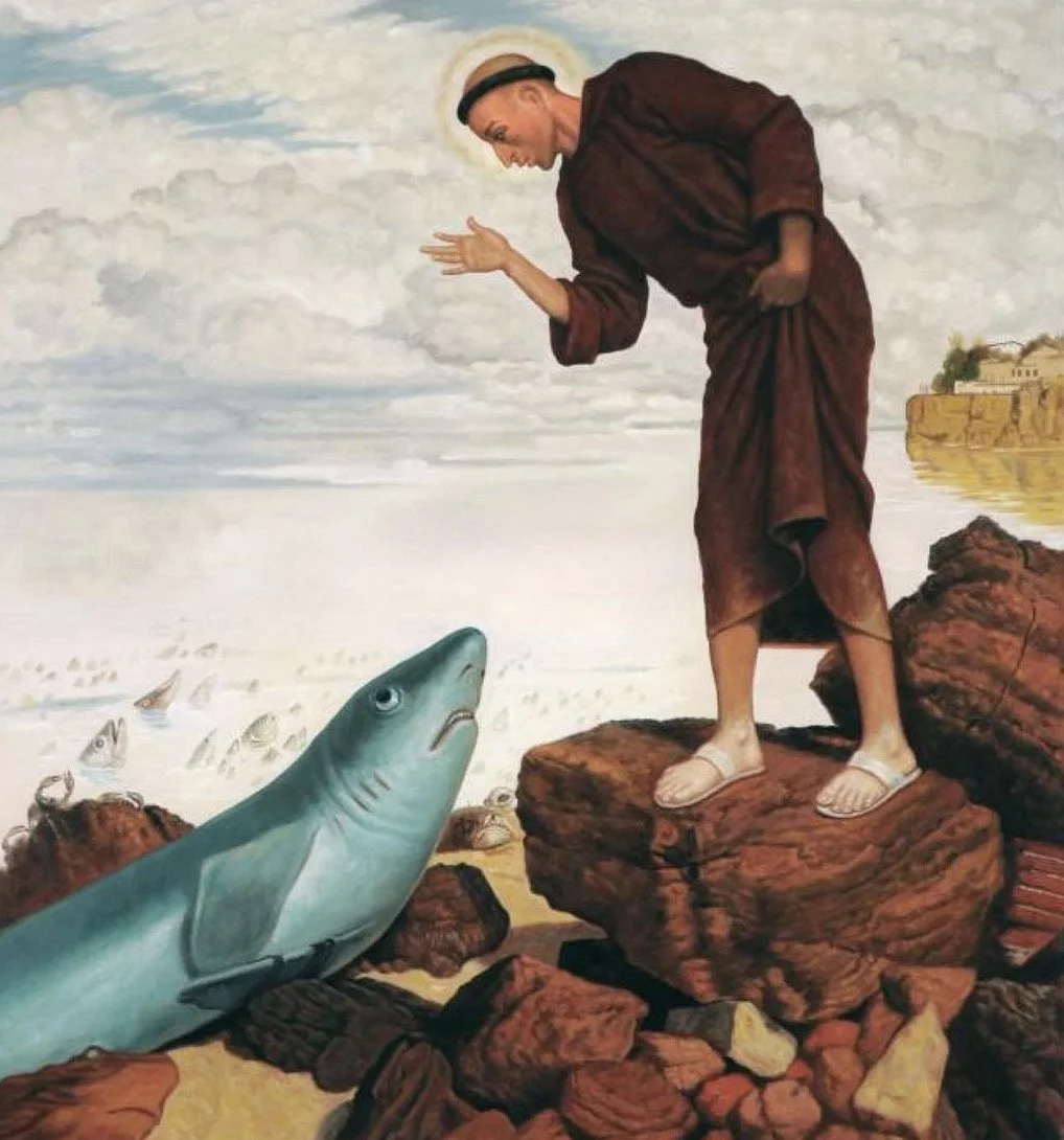 Erica: Arnold Böcklin’s “St Anthony Preaching to the Fish” was painted 300 years later yet evokes the Renaissance. This painting is so charming with the shark raising its eyes in a comically attentive manner. In his depiction of the rocks, the craggy surfaces are carefully rendered, but if you look at the shadows, the rocks appear supernatural as if defying gravity. The combination of anthropomorphised sea creatures (check out the grumpy face on the fish peeking from between the rocks) and realistic depiction of the natural world makes this an especially delightful work.
