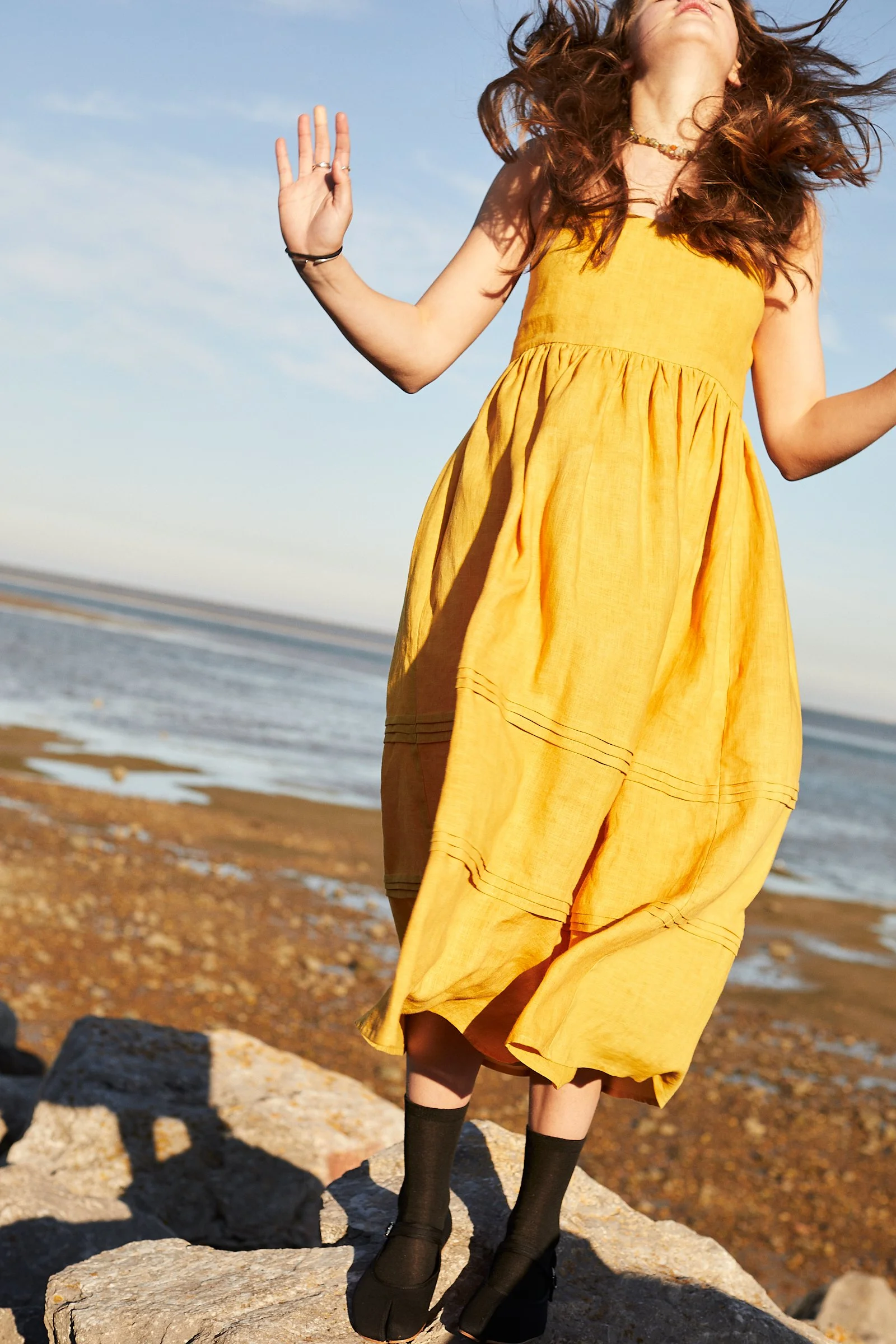 Our Erica dress is made in the finest Irish linen. The Marigold colourway has been dyed using madder and weld.